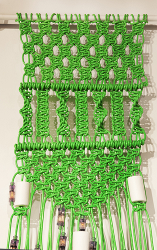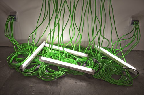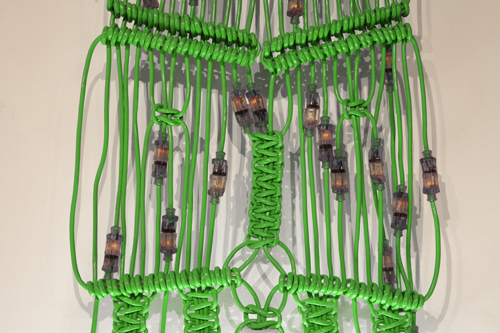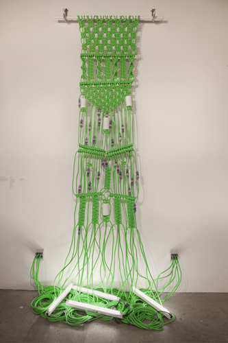 In using macramé, a craft technique, to weave a functional item (extension cords) the boundaries that exist when classifying objects and the ease in which value/meaning can be transformed via context, form and authorship are questioned. However, in the end the cords remain true to their original use as the sculpture also powers a group of fluorescent lights.
