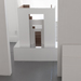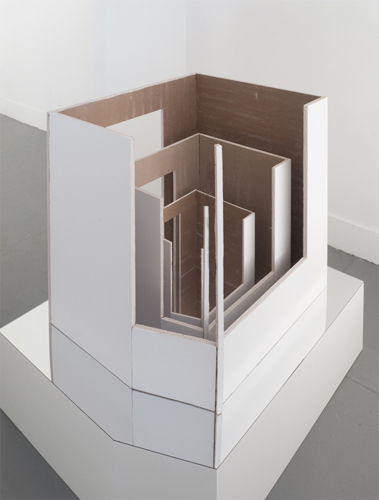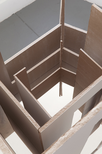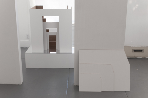 In this site-specific piece, nesting scale models of an artist-built room from a previous exhibition were made from drywall and presented on a mirrored pedestal inside the room.